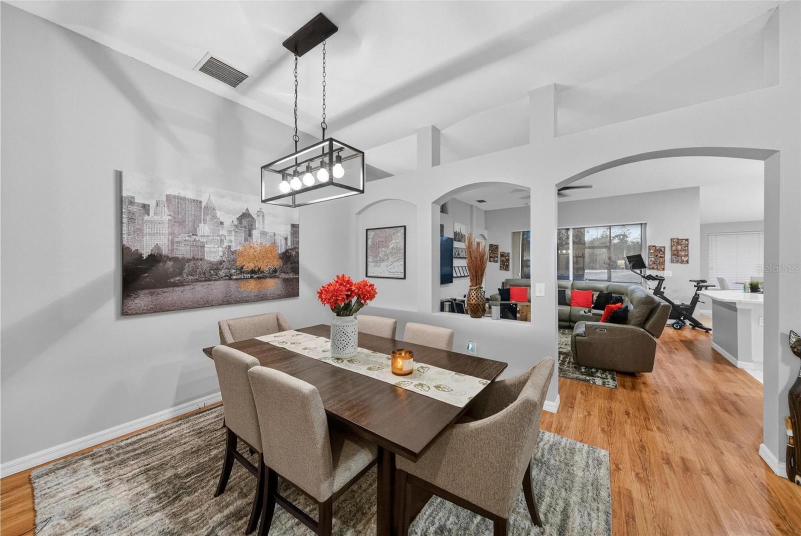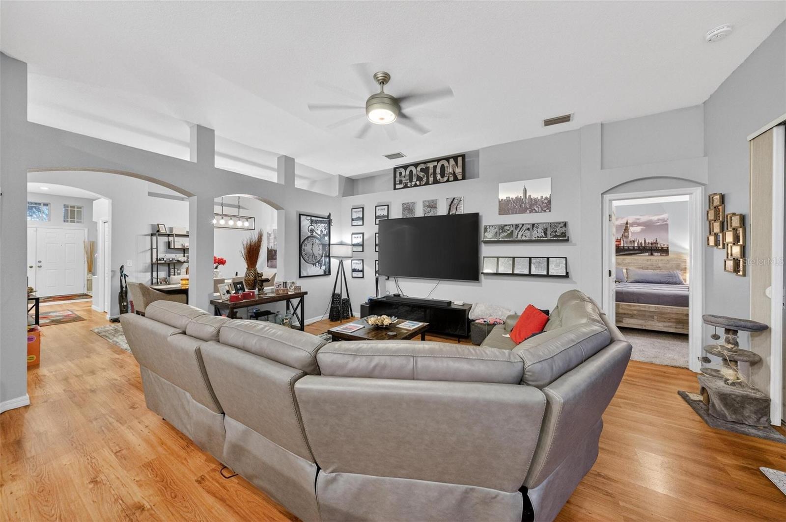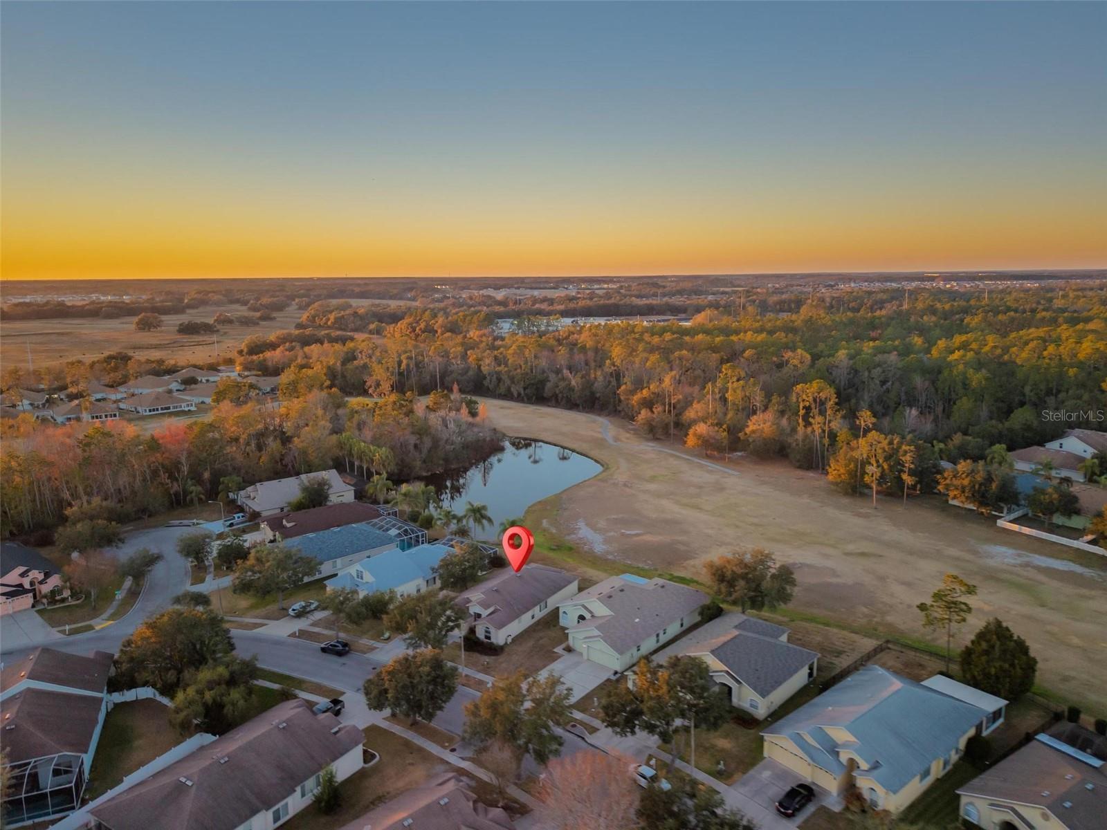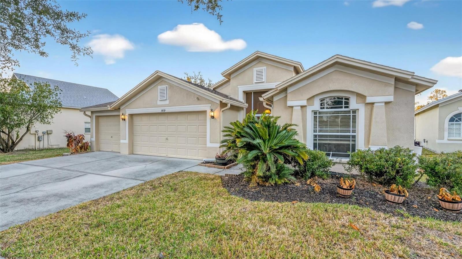 Welcome home to sweeping golf course and pond views in the highly sought-after Lake Bernadette community. This beautifully maintained 4-bedroom, 2-bath, single-story home with a 3-car garage delivers space, light, and a layout designed for both everyday comfort and effortless entertaining. From the moment you enter, you’ll notice high ceilings, elegant archways, and abundant natural light flowing through the open yet well-defined floor plan. Separate formal living and dining rooms provide flexibility, while the spacious family room opens through sliding glass doors to a screened patio with hot tub, extending to a brick-paver outdoor area perfectly positioned to enjoy peaceful water and fairway views. The kitchen is generously sized and thoughtfully designed with ample cabinetry, bar seating, and a cozy breakfast nook, making it ideal for casual meals or hosting friends and family. Privately located at the rear of the home, the primary suite offers serene views and a spa-like ensuite featuring a walk-in shower, garden tub, dual vanities, and a large walk-in closet. Three additional bedrooms provide excellent versatility for guests, a home office, or flex space. A dedicated laundry room with storage shelving adds convenience, while the 3-car garage offers plenty of room for vehicles, storage, or a golf cart. Located just minutes from shopping, dining, medical facilities, and easy access to I-75, Lake Bernadette residents enjoy outstanding amenities including two pools, a fitness center, tennis and basketball courts, a playground, and clubhouse. With low HOA fees, CDD benefits, and a prime setting, this home delivers exceptional value and the Florida lifestyle buyers are searching for. A rare opportunity to own a move-in-ready home with views, space, and community amenities—schedule your showing today.