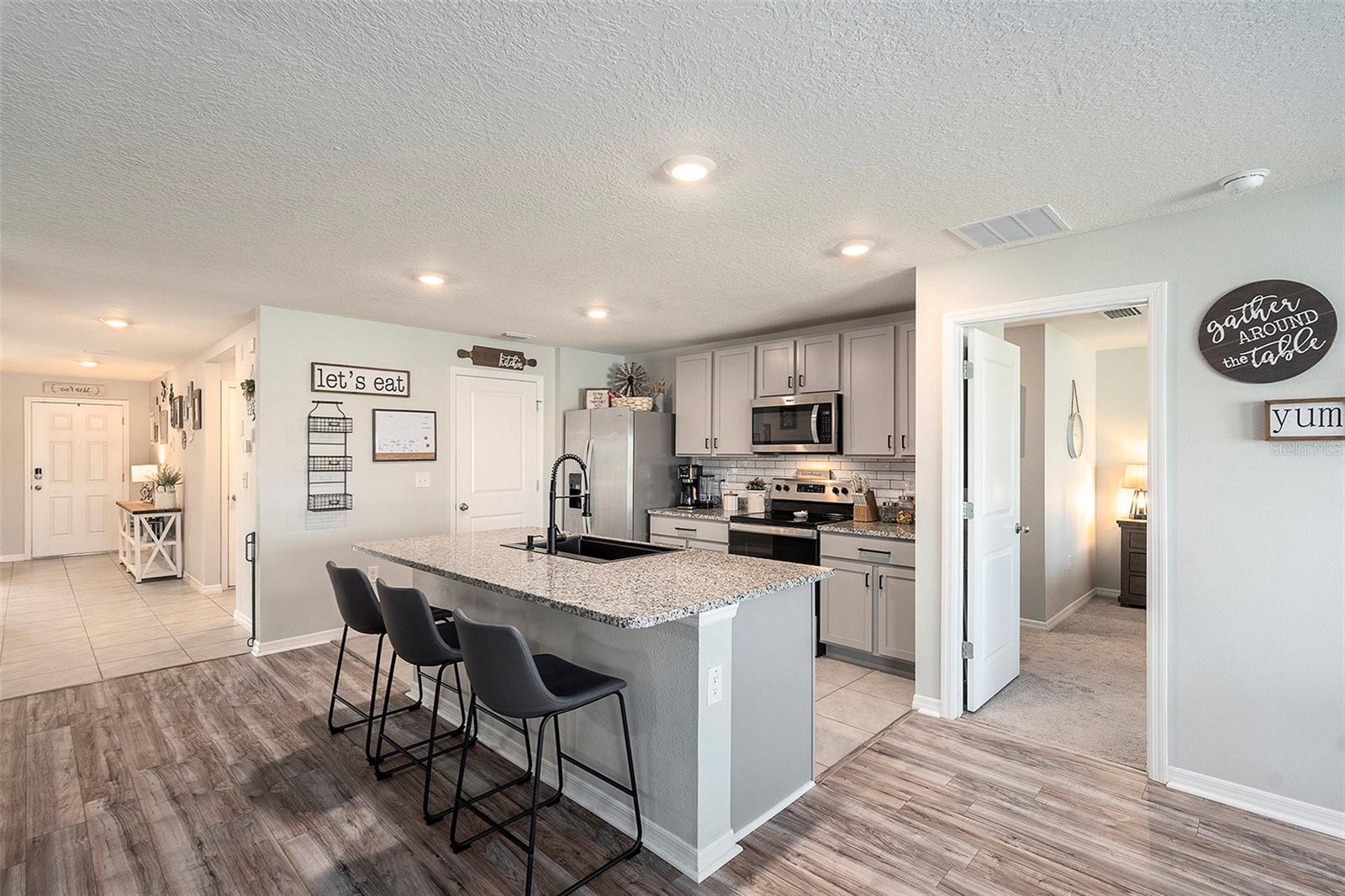 Beautiful Home with a view to match! Florida living at its best, pond views with multiple fountains! This home has endless features! Access your new Smart Home via Keyless Entry and a fully wired security system! The split floor plan with 2 bedrooms and 1 bathroom located at the front of the house. With a large master bedroom and on suite bath in the rear of the home with water views! Separate laundry room with new cabinets and shelving! The open floorplan with LVP flooring in the main living and kitchen areas! Accent lights above and below the kitchen cabinets, upgraded oversized sink, new hardware, an oversized pantry and more! Master Bedroom has water views, the master bath includes a large walk-in closet, linen closet and dual sinks. Enjoy the screened Lanai overlooking the large pond with a backyard that is fully fenced.. Amenities include a Pool, clubhouse, dog park and playground. Come check it out today!