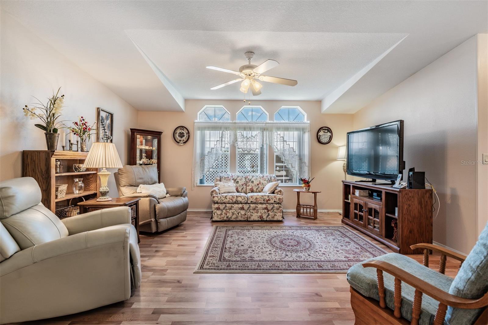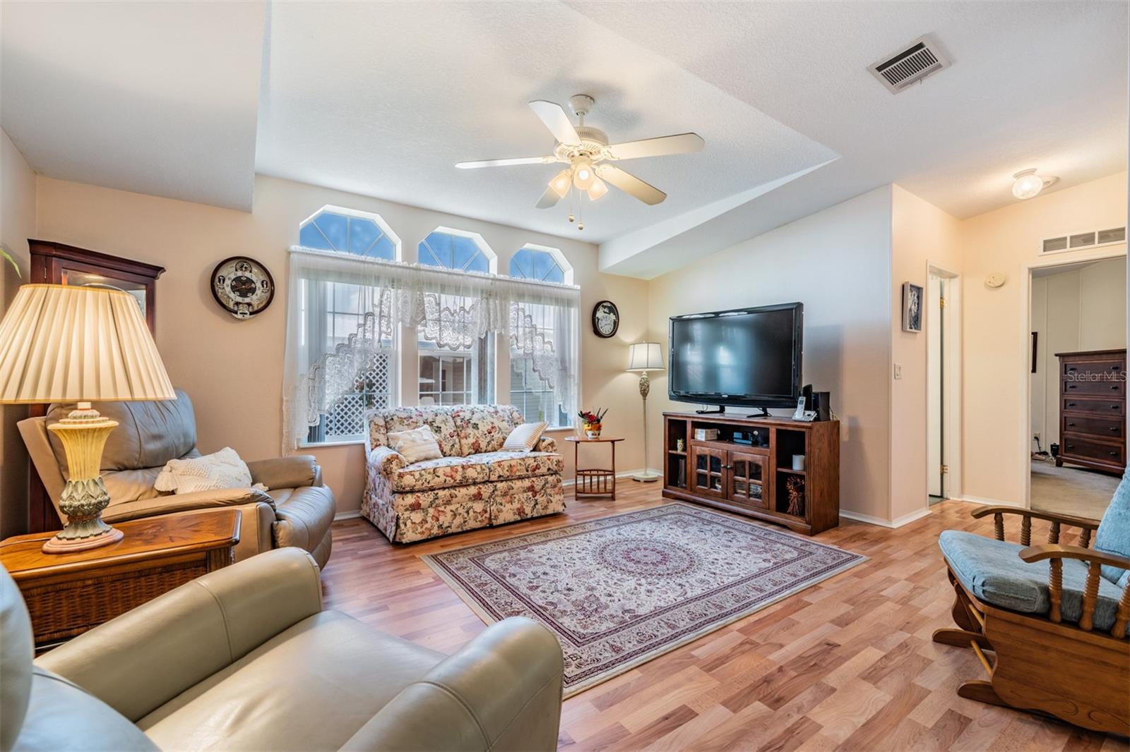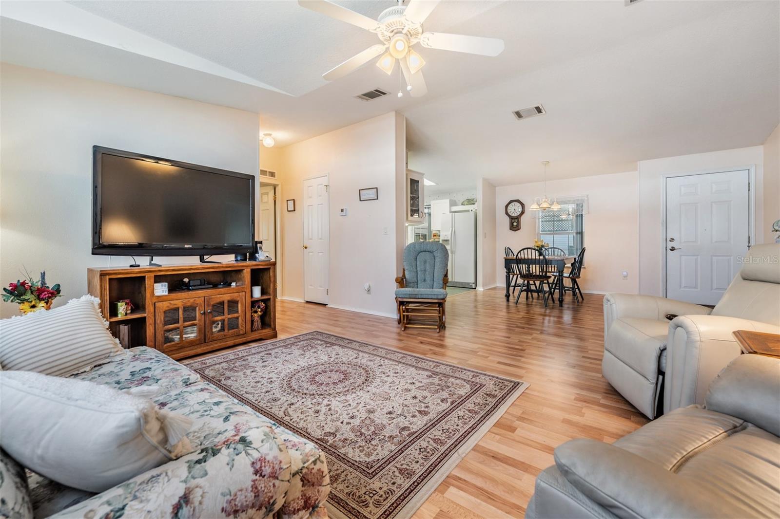 WELCOME HOME to this spacious 2-bedroom, 2-bathroom Jacobsen home in the premier 55+ gated community of Grand Horizons, where you OWN your LAND! NEW ROOF October 2024! Bring your suitcase and MOVE RIGHT IN! Light, Bright, OPEN Concept floor plan boasts large GREAT room featuring engineered laminate wood floors and elegant window treatments. The OPEN dining area accommodates a large table and chairs for entertaining family and friends! Galley kitchen boasts custom glass-doored cabinets, eat-in kitchen with tiled floors and breakfast nook that opens up to a bright Florida sunroom. Dont miss the BACK OUTDOOR PATIO just off the sunroom! In this spilt bedroom plan, the primary bedroom offers a walk-in closet, an en-suite bathroom with dual sinks and a shower, while the second bedroom, located at the opposite side of the home next to the hall bath, also includes a walk-in closet. NEW ROOF 2024, 2024 Water Heater and LOADS OF UPGRADES include screened patio with windows, sun protectors, an insulated roof, thermal pane windows, and Rheem air conditioner with a 10-year transferable warranty. The property sits on a large (60 x 100) OWNED LOt , is High and Dry and includes a storage/work area, open patio and additional space to relax in the enclosed sunroom. Located in this resident-owned 55+ community, Grand Horizons offers a wide range of amenities, including a clubhouse with a heated pool and spa, shuffleboard, billiards, a library with games, puzzles, movies & book exchanges, craft/sewing/hobby room, commercial grade kitchen, billiards room, travel excursions and various onsite entertainment and organized activities with a low HOA and No CDD fees at all. Located just north of Tampa and conveniently close to medical facilities, restaurants, shopping centers, and entertainment options such as a movie theater and bowling alley, fitness center, YMCA and making it the perfect choice for those seeking a relaxing and convenient lifestyle in a GATED, well maintained, well-equipped community... Furnishings negotiable... MOTIVATED SELLER IS READY TO SELL.. Bring offers and CALL TODAY!