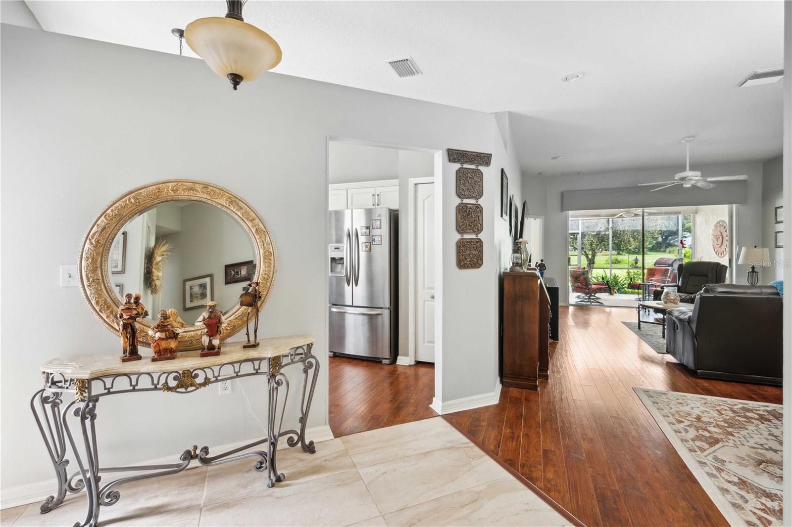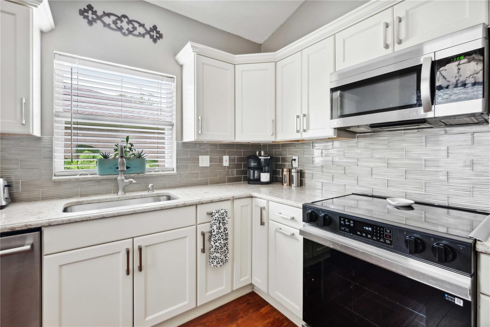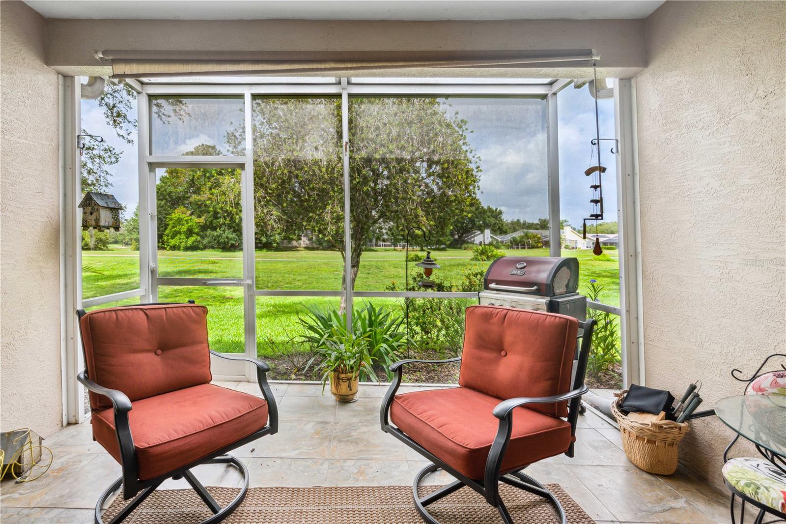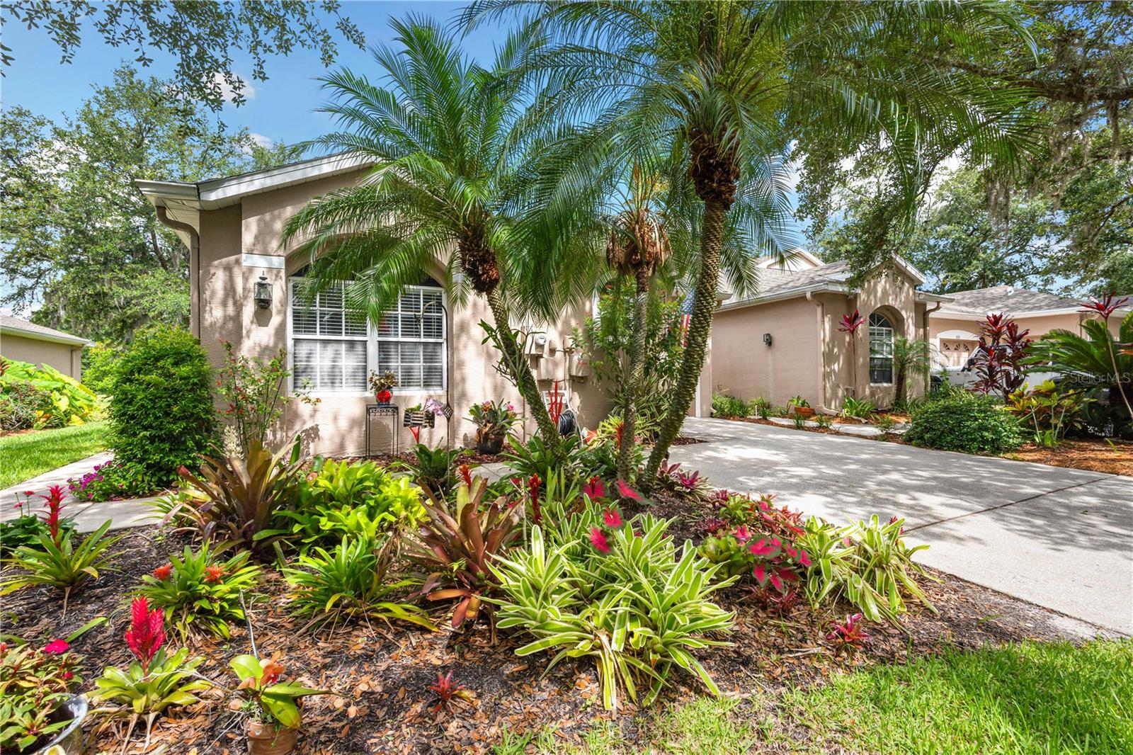 Enjoy golf course living in this beautifully updated 3-bedroom, 2.5-bath Villa located right by the 6th hole-perfect for early morning tee times or sunset strolls in the backyard. Step inside to find custom-built kitchen cabinetry with sleek Quartz Cambria countertops, a chef's delight whether you're whipping up snacks or holiday meals. The open floor plan boasts no carpeting, making spills a little less dramatic and clean ups a breeze. Tile floors flow throughout, including the entryway, lanai, and even the front porch. The tile lanai extends your living space into the outdoors-just right for sipping your morning coffee or relaxing with a good book. The primary bedroom is spacious and thoughtfully designed with an updated walk-in shower and a garden tub. Two additional bedroom and guest bath provide flexibility for family, hobbies, or visitors. Recent updates include a 2023 air conditioning system for year-round comfort, and the community HOA helps simplify life by covering the roof, exterior paint, and private road maintenance. Love your golf cart? It'll have its own garage space or can be used for storage. This villa combines thoughtful updates, low maintenance living, and a prime community location to provide a lifestyle that's convienent and comfortable. Great location near Publix and restaurants. Come take a look-your next chapter might just begin here.