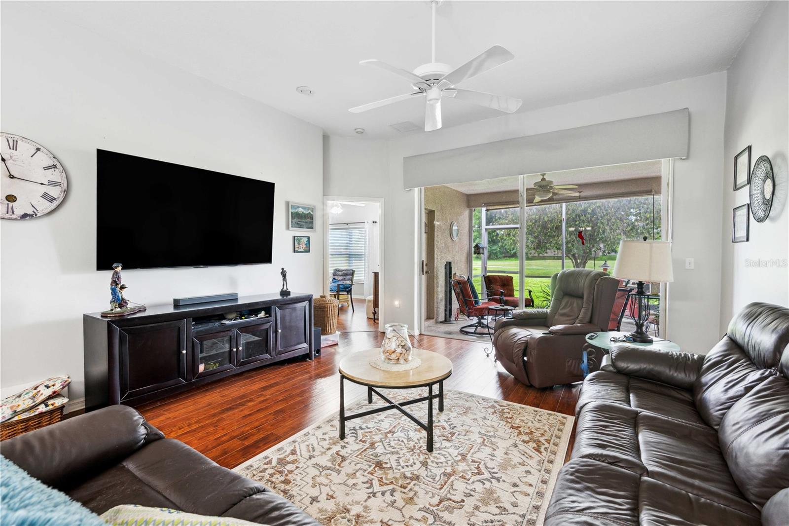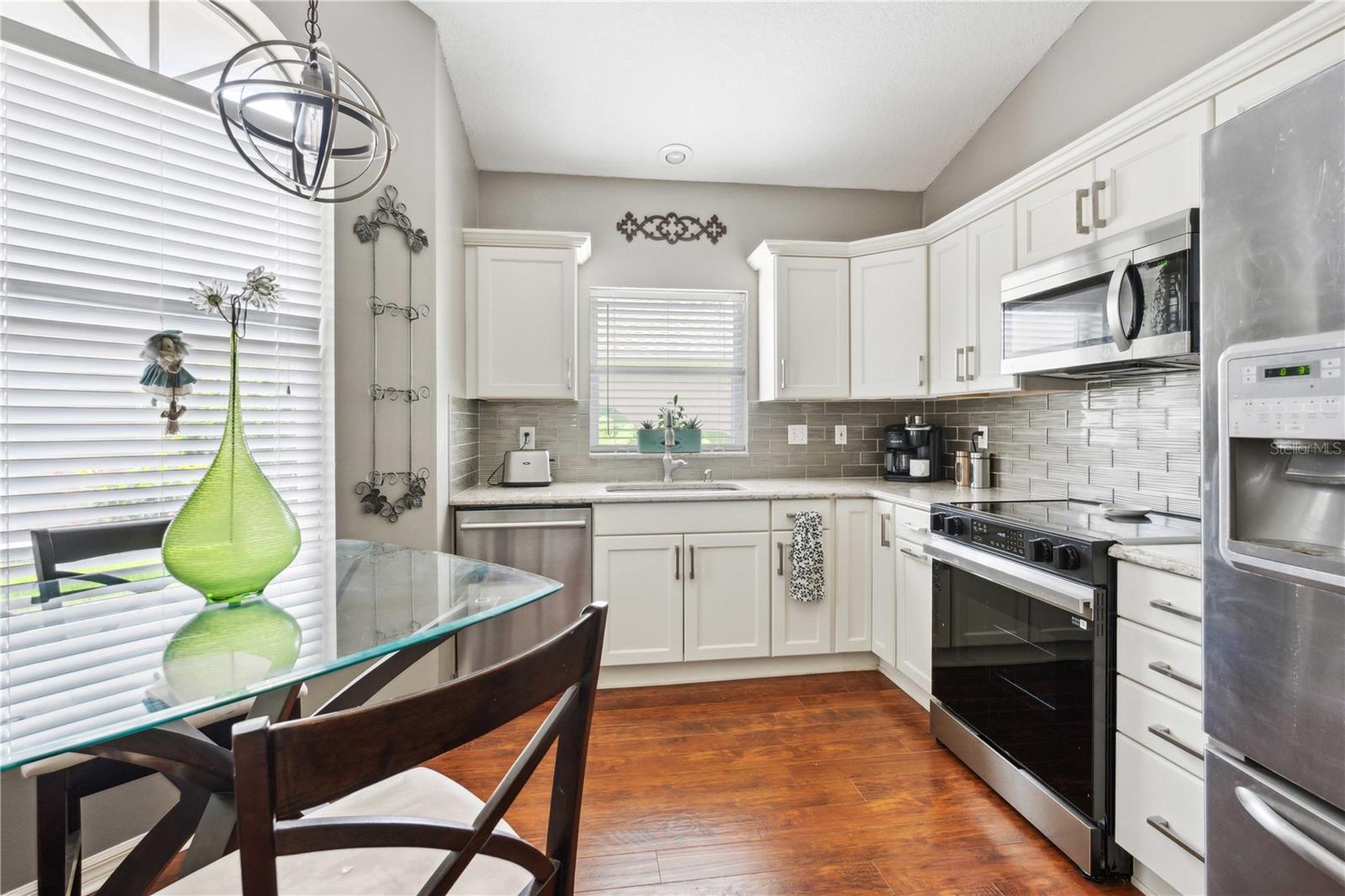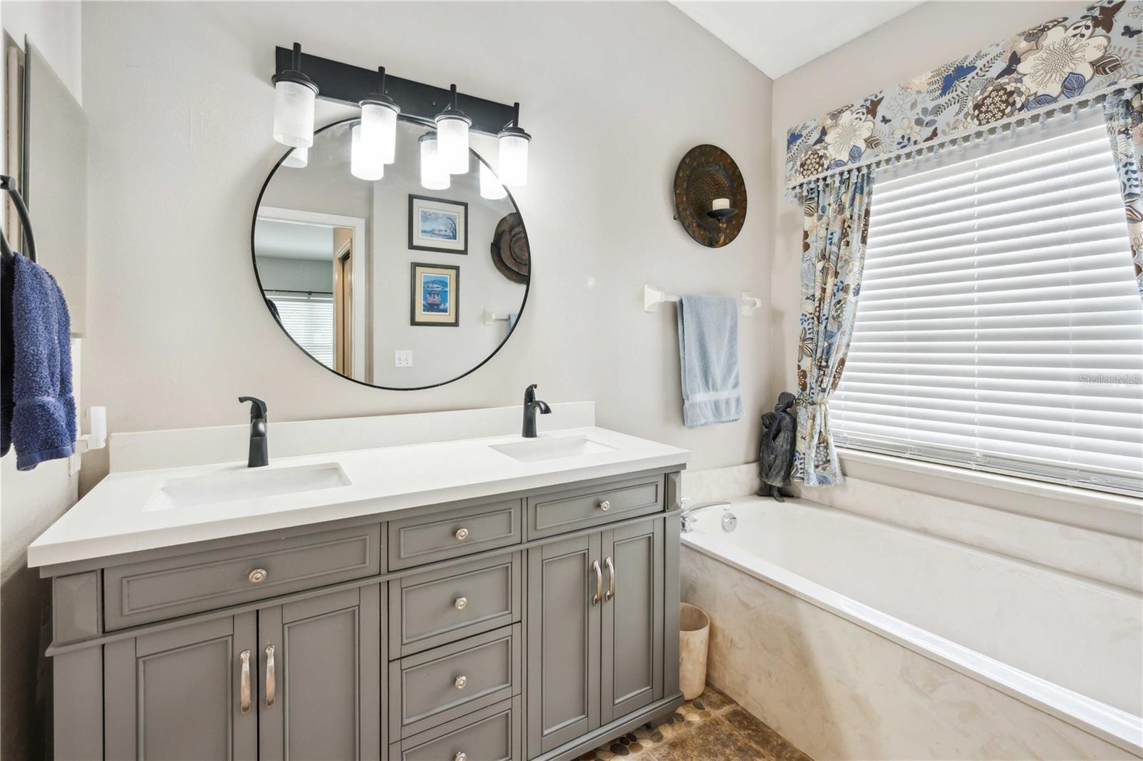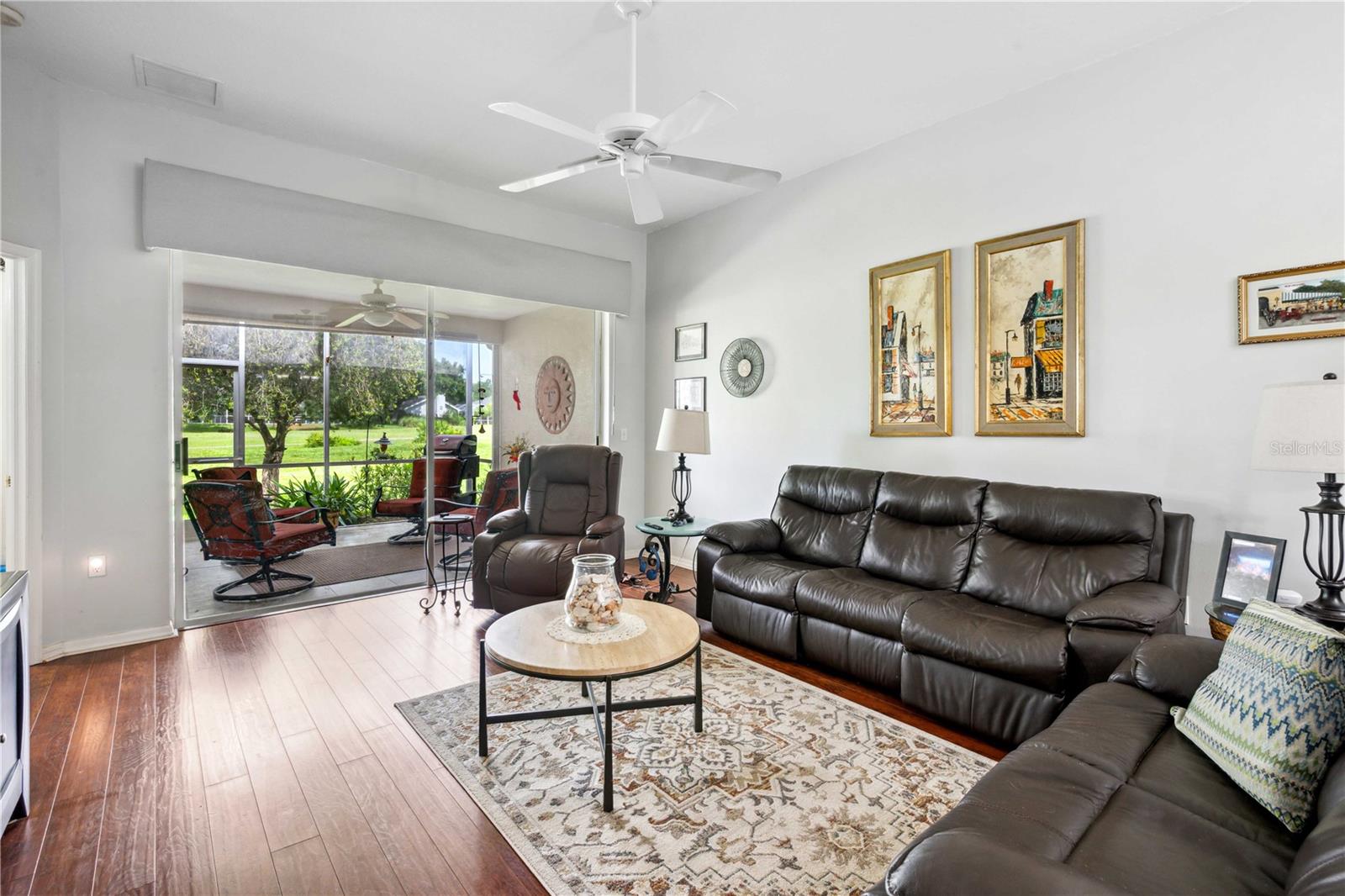 Enjoy golf course living in this beautifully updated 3-bedroom, 2.5-bath Villa located right by the 6th hole-perfect for early morning tee times or sunset strolls in the backyard. Step inside to find custom-built kitchen cabinetry with sleek Quartz Cambria countertops, a chef's delight whether you're whipping up snacks or holiday meals. The open floor plan boasts no carpeting, making spills a little less dramatic and clean ups a breeze. Tile floors flow throughout, including the entryway, lanai, and even the front porch. The tile lanai extends your living space into the outdoors-just right for sipping your morning coffee or relaxing with a good book. The primary bedroom is spacious and thoughtfully designed with an updated walk-in shower and a garden tub. Two additional bedroom and guest bath provide flexibility for family, hobbies, or visitors. Recent updates include a 2023 air conditioning system for year-round comfort, and the community HOA helps simplify life by covering the roof, exterior paint, and private road maintenance. Love your golf cart? It'll have its own garage space or can be used for storage. This villa combines thoughtful updates, low maintenance living, and a prime community location to provide a lifestyle that's convienent and comfortable. Great location near Publix and restaurants. Come take a look-your next chapter might just begin here.