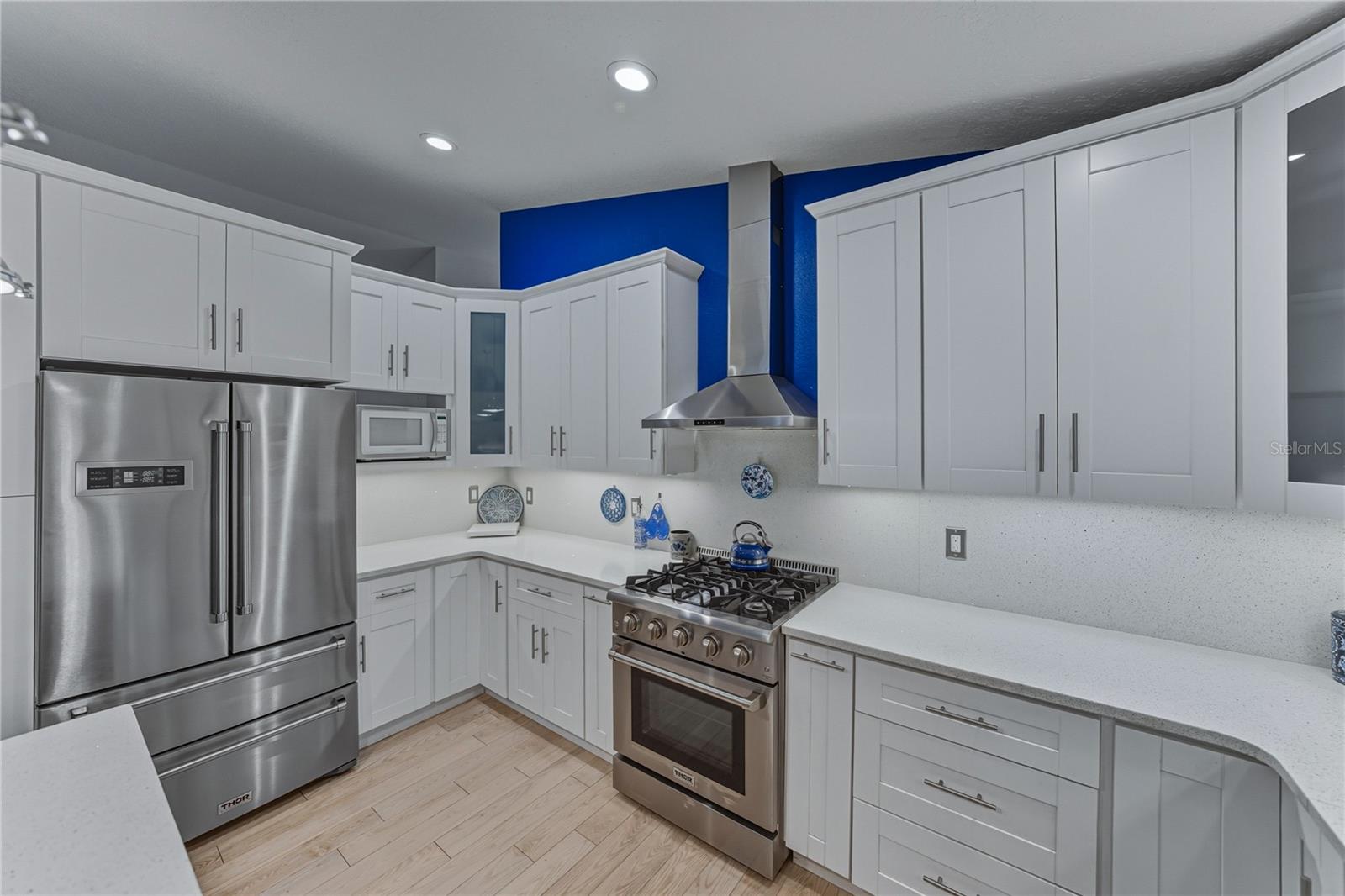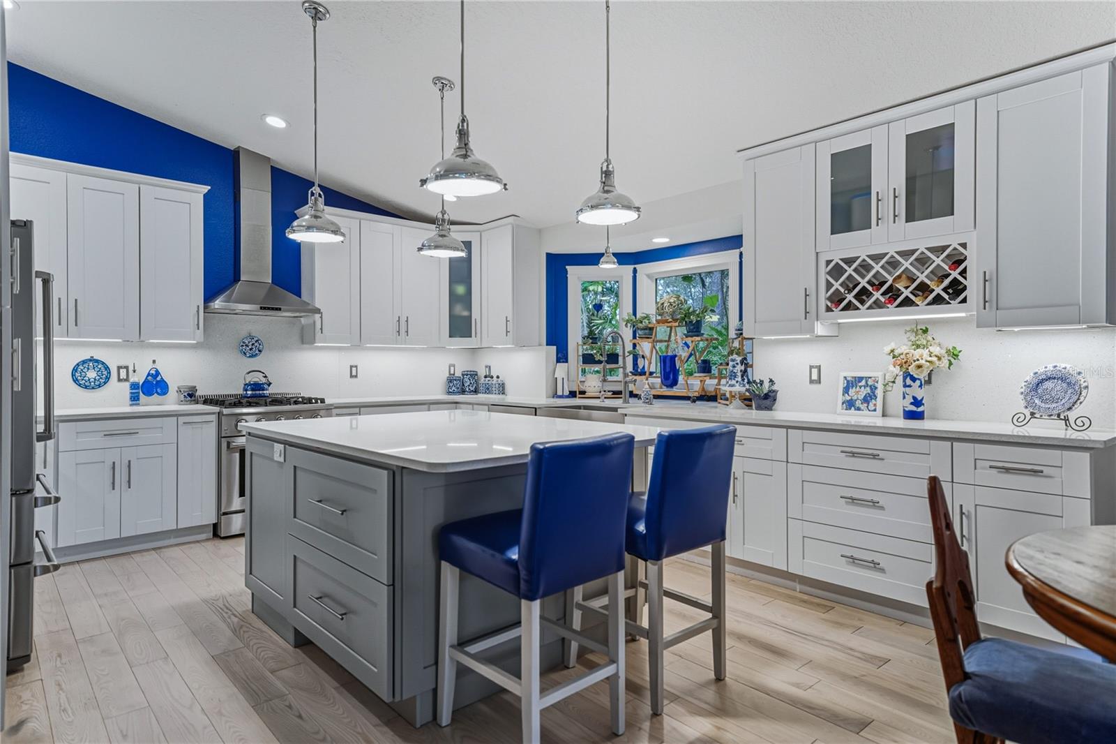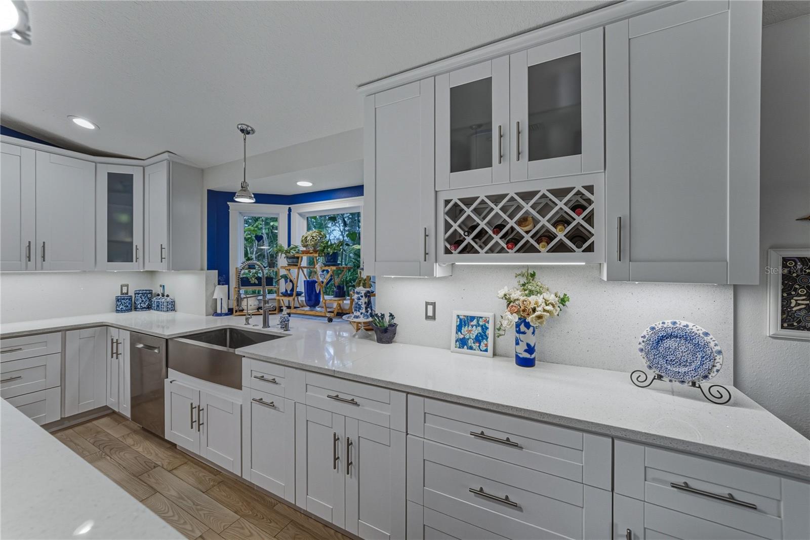 Peacefully located along a sidewalk-lined street in the amenity-rich Lake Bernadette community, this inviting 3 bedroom, 2 bath, 2 car garage home makes a warm first impression with lush landscaping and a welcoming covered entry. From the moment you step inside, the layout feels open and comfortable, with vaulted ceilings, abundant natural light, and 2019 hardwood flooring flowing seamlessly through the main living areas. A dedicated dining space and expansive windows frame the living area, while sliding glass doors draw you naturally toward the heart of the home. The 2019 renovated kitchen is a masterpiece and truly needs to be experienced in person. Thoughtfully designed with quartz countertops, a central island with breakfast bar seating, and a built-in KitchenAid cabinet, the space combines beauty with everyday function. Stainless steel appliances include a gas range, paired with a farmhouse-style stainless sink set beneath a charming bay window. Soft-close cabinetry with interior lighting, a quartz slab backsplash, updated lighting, and a sunny eat-in dinette complete the space, with sliding doors leading directly to the enclosed porch for easy indoor-outdoor living. The primary suite is privately positioned away from the secondary bedrooms and offers a tranquil retreat, complete with French doors opening to the lanai, a spacious walk-in closet, and a fully transformed ensuite bath. Designed with spa-like detail, the bathroom features a river rock accented floor, dual sinks with vanity seating, an LED mirror with heat and Bluetooth capability, extra storage, and a striking walk-in shower with a rainfall showerhead featuring color lighting, a magnetic wand showerhead, and built-in bench seating. On the opposite side of the home, two generously sized secondary bedrooms share a well-appointed bathroom with a quartz-topped vanity and tub and shower combination. A convenient laundry room connects directly to the oversized garage, freshly painted in 2026 and packed with functionality. The garage offers abundant storage, a utility sink, a screened garage door, an extra reinforced tornado-rated garage door, a side door replaced in 2019, and even an AC duct for comfort while working on projects. Outdoors, the fully vinyl-fenced backyard is designed for privacy and versatility, featuring tropical landscaping, a screened lanai, an enclosed porch, and an attached storage shed with electric and lighting already in place. Additional highlights include a double gate, extra exterior hose bibs, and 220 wiring on the patio just off the primary bedroom, already set up for a future hot tub with its own breaker. A Generac whole-house generator conveys and automatically powers the home for added peace of mind. Roof 2014, AC 2019, Water Heater 2022. Life in Lake Bernadette offers more than just a beautiful home. Residents enjoy two community pools, including one that is heated, along with a recreation center, fitness center, basketball and tennis courts, a playground, and miles of sidewalks throughout the neighborhood, even along the main boulevard. Conveniently positioned between Eiland Boulevard and State Road 54, this location provides easy access to all that Zephyrhills provides, with Wesley Chapel, New Tampa, and the interstate just a short drive away. Homes with this level of care, thoughtful upgrades, and community amenities are hard to find. Call today to schedule your private showing and experience it for yourself.