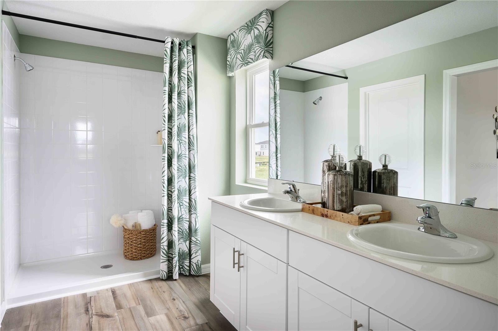 Under Construction. Indigo - Check out the Indigo, a spacious two-story, 5-bedroom, 3-bathroom, 2-car garage home perfect for growing families or hosting guests. Enter the impressive foyer with soaring ceilings that creates an immediate sense of openness. From the foyer, the home effortlessly flows into the main living areas and kitchen. With quartz countertops throughout, stainless-steel appliances and a smart thermostat for energy efficient climate control, the Indigo brings all the things that matter together. The downstairs guest suite and bathroom are tucked away for added seclusion, while the open concept living space is perfect for entertaining. Upstairs, you'll find a generously sized recreation space, ideal for family time or unwinding. The owner's suite is a true sanctuary, featuring a walk-in shower, double vanities, and a spacious walk-in closet. A laundry room with a new washer and dryer is just off the owner’s suite, conveniently located near the 3 additional bedrooms and full bathroom. The Indigo is as functional as it is stylish, providing the perfect balance of comfort and modern living. Life at Two Rivers blends nature with vibrant community living. Residents enjoy access to The Nest amenity hub, featuring a resort-style pool, playground, and dog park, along with wooded landscapes, winding creeks, scenic ponds, and peaceful lakes throughout the community. Nearby shopping and dining at The Grove at Wesley Chapel is also just 10 minutes away. Images shown are for illustrative purposes only and may differ from actual home. Completion date subject to change.