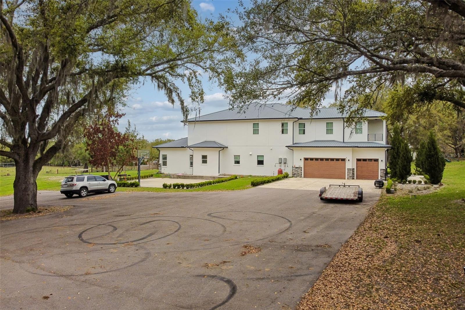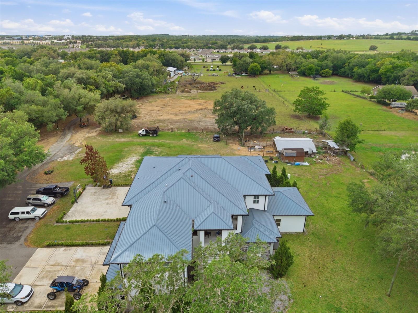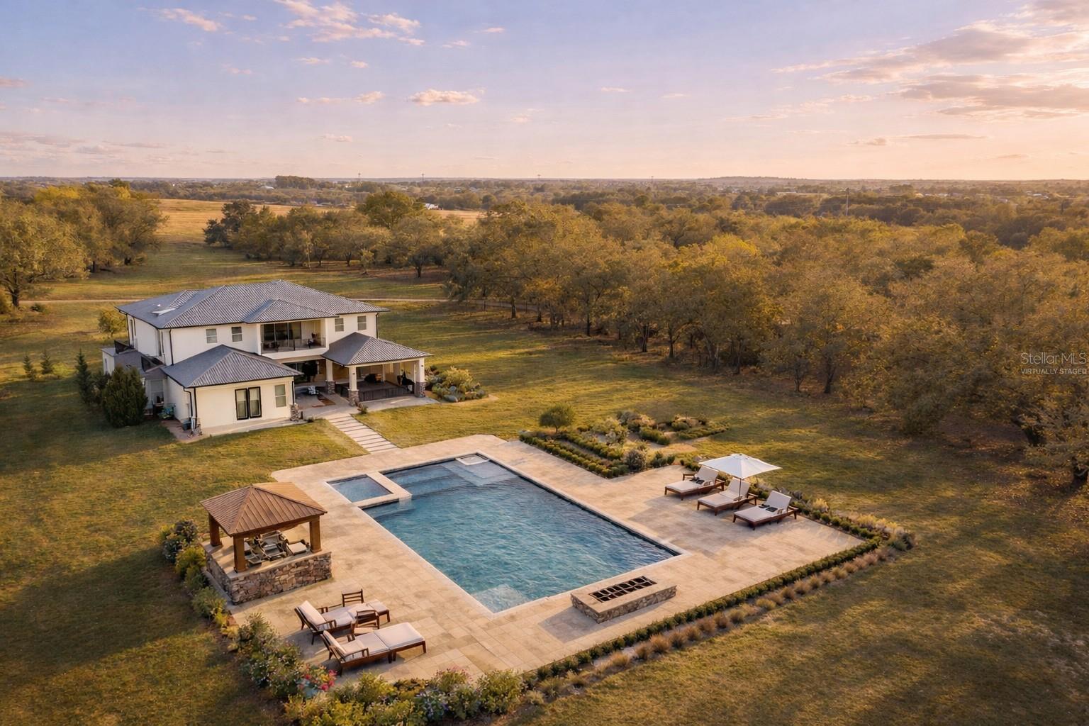One or more photo(s) has been virtually staged. Imagine waking up on your own ELEVATED HILLTOP, coffee in hand, stepping onto a private balcony where the sun rises over nearly five acres of your own Florida countryside. That evening, you watch it set from the back balcony. And after the little ones are tucked in, the stars come out — and out here, there are MORE stars than you ever thought possible. Welcome to 8241 Cass Road. A CUSTOM 2020 LUXURY ESTATE built by a builder for his own family — 5 bedrooms, 4 full and 3 half baths, and 7,521 square feet of living space that was designed from the ground up to HOST, GATHER, AND GROW. This is a home for the family that wants ROOM TO BREATHE. Room for 100+ guests at your next celebration, thanks to pocket sliders that disappear into the walls and let the entire first floor flow into the outdoors. Room for the little ones to run — there's a HALF BASKETBALL COURT waiting for after-school shootarounds and weekend pickup games. Room for a HOME THEATER experience you'd expect at a luxury resort, with a FIBER-OPTIC STARLIGHT CEILING that transforms every movie night into something your little ones will remember forever. Room for an executive who works from home and finally has the private office they've been dreaming about. Room for the home chef who's been waiting for a SUB-ZERO and a WOLF RANGE. Room for horses, cows, or a working homestead on your own AGRICULTURALLY ZONED LAND — no HOA telling you what you can and can't do with your own property. Every bedroom has its own walk-in closet and en-suite access. The first-floor primary suite is its own spa retreat. Smart home automation runs the whole house from your phone. Whole-home speaker system. All-call intercom. FLOOD ZONE X. Metal roof. Foam insulation. This home was BUILT TO LAST GENERATIONS. And here's what you won't find in Wesley Chapel, Wiregrass, or Two Rivers: FOUR-POINT-NINE-FOUR PRIVATE ACRES. No shared walls. No architectural review board. No drive-by traffic through your front yard. Just YOUR land, YOUR sky, and the peace of mind that comes from finally owning something no one can take away. ALSO AVAILABLE — THE ADJACENT 4.89 ACRES: The parcel next door at 8236/8302 Wire Road is also for sale — SEPARATELY OR AS A COMBINED 9.83-ACRE FAMILY COMPOUND. Ask the listing agent about the rare opportunity to lock down both. Multi-generational families and equestrian buyers take note. Ten minutes to Two Rivers. Twenty minutes to Wiregrass, Tampa Premium Outlets, and AdventHealth Wesley Chapel. Under an hour to downtown Tampa and the airport.